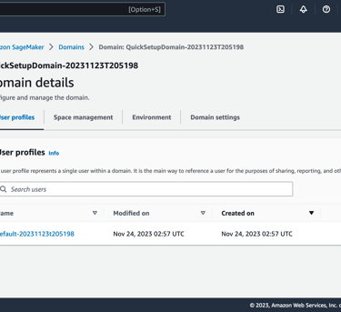 Once the domain is ready (status="InService"), click on the domain name (QuickSetupDomain-*) to access the user profiles. The quick set up option creates a default user profile.