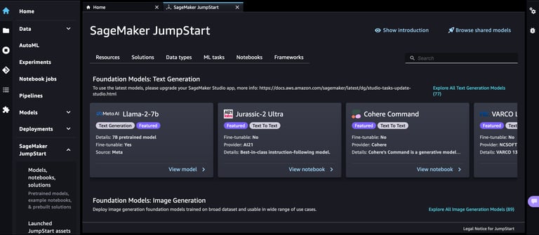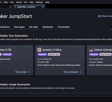 Amazon SageMaker Studio is a web-based, integrated development environment (IDE) for machine learning that allows you build, train, debug, deploy, and monitor your machine learning models. One of the easy ways to start exploring generative AI as well as machine learning in general is using SageMaker JumpStart - a machine learning hub that provides pre-trained models, solution templates, and examples. This includes many of the popular open source models such as Llama-2 and Falcon models as well as third party models such as Jurassic-2. You can access JumpStart models and solutions through the JumpStart landing page in Amazon SageMaker Studio.