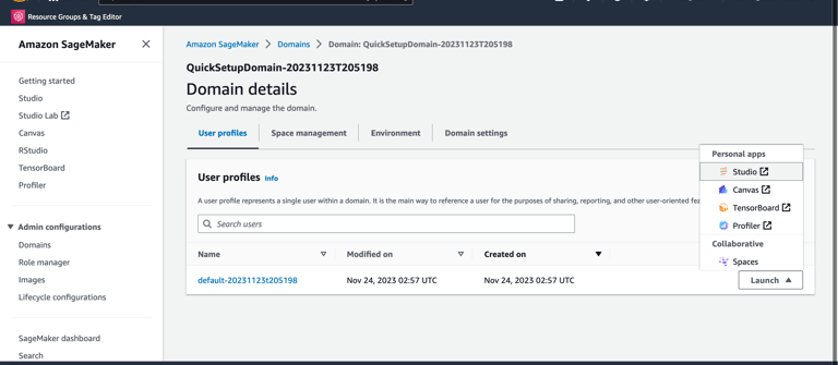 Use the Launch button and click on Studio option to access SageMaker Studio environment. First time access may take a few minutes.