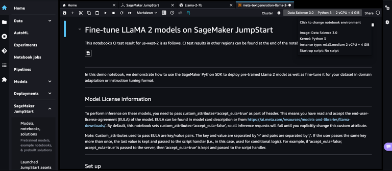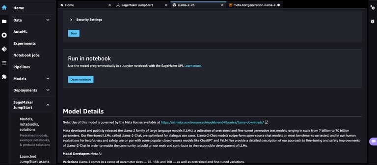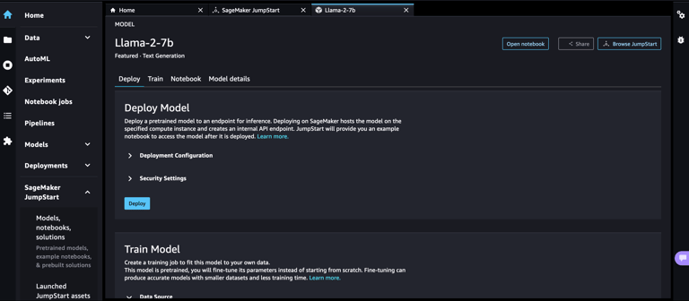 Amazon SageMaker is a comprehensive machine learning service from AWS that allows you to quickly build, train, and deploy machine learning models. SageMaker provides a wide range of tools and features to help you through the end to end machine learning life cycle. This blog post discusses how to quickly get started with your generative AI journey by training and deploying your models using two key SageMaker tools or features, 1/Amazon SageMaker Studio and 2/SageMaker JumpStart.